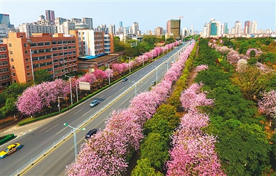 近年来,广西柳州突出绿色发展理念,实现从"酸雨之都"到"花海城市"的蝶变。图为4月12日,紫荆花盛开的柳州市学院路。