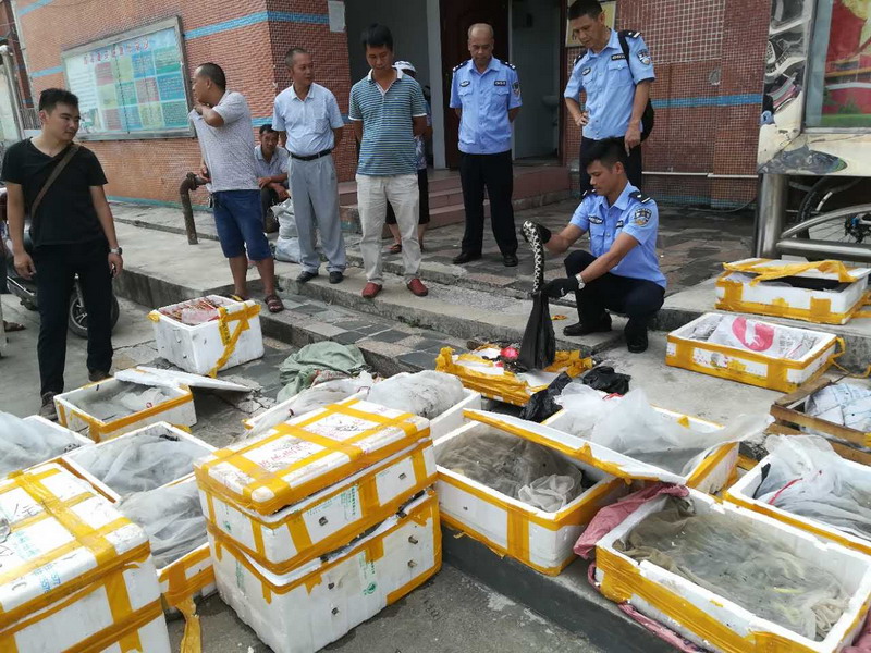 9月14日凌晨3时许,八步区林业局林业综合行政执法大队在灵峰镇高速出口截获一辆桂C25xxx的大巴车,该车起始地点为桂林至广州罗冲围。执法人员当即对该大巴车进行全面检查,在行李仓内发现14件泡沫箱包装的动物活体,其中5件泡沫箱内装的是水律蛇、银环蛇、眼镜蛇、五步蛇;有9件泡沫箱内装的是青蛙、长腰蛙、石蛙。此外,还发现22件木箱包装动物活体,均是青蛙。此次查获的水律蛇约220条,银环蛇约150条,眼镜蛇约30条,五步蛇约30条,青蛙800只,长腰蛙500只,石蛙200只。其中水律蛇、银环蛇和眼镜蛇为国家"三有"保护动物。